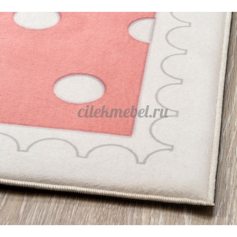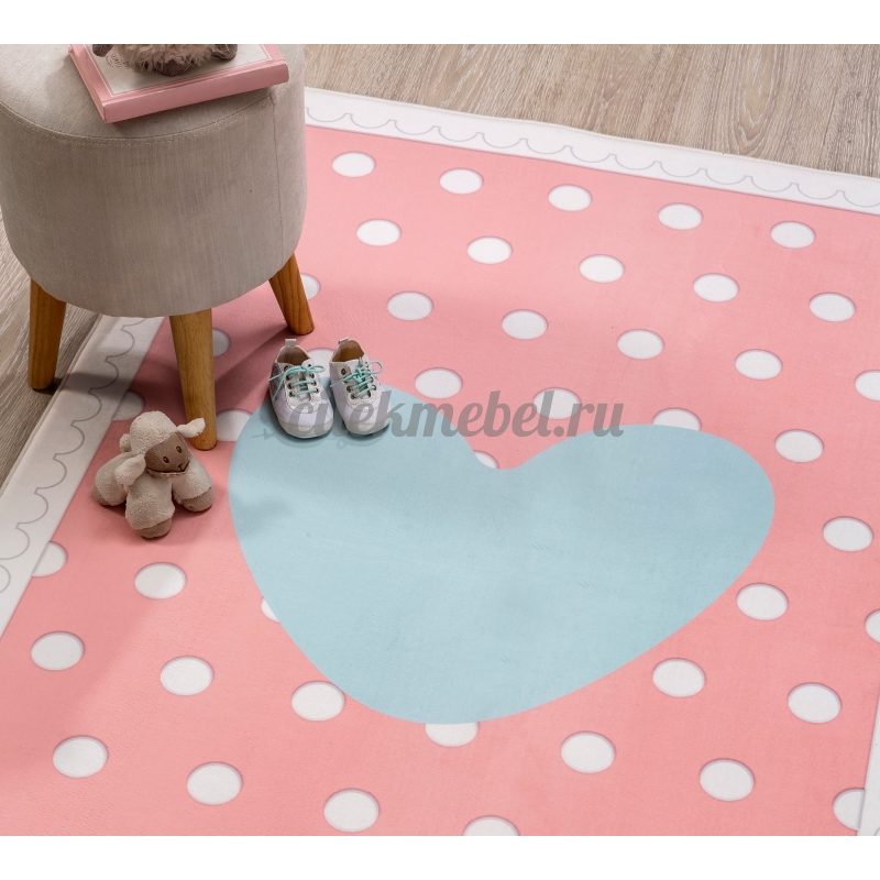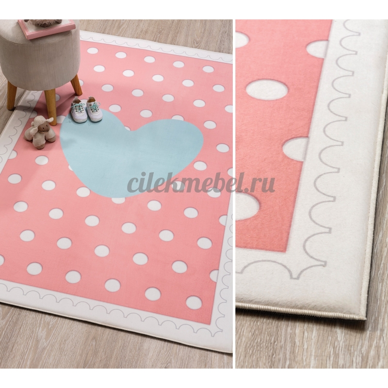 Ковер Cilek Soft Happy для оформления комнаты девочки. Основу декора составляет розовый фон с крупным белым горохом и расположенным посередине зеленым сердцем. Периметр ковра оформлен белой окантовкой, элементы рисунка создают на поверхности рифление. Цвета неяркие, универсально дополнят интерьер.