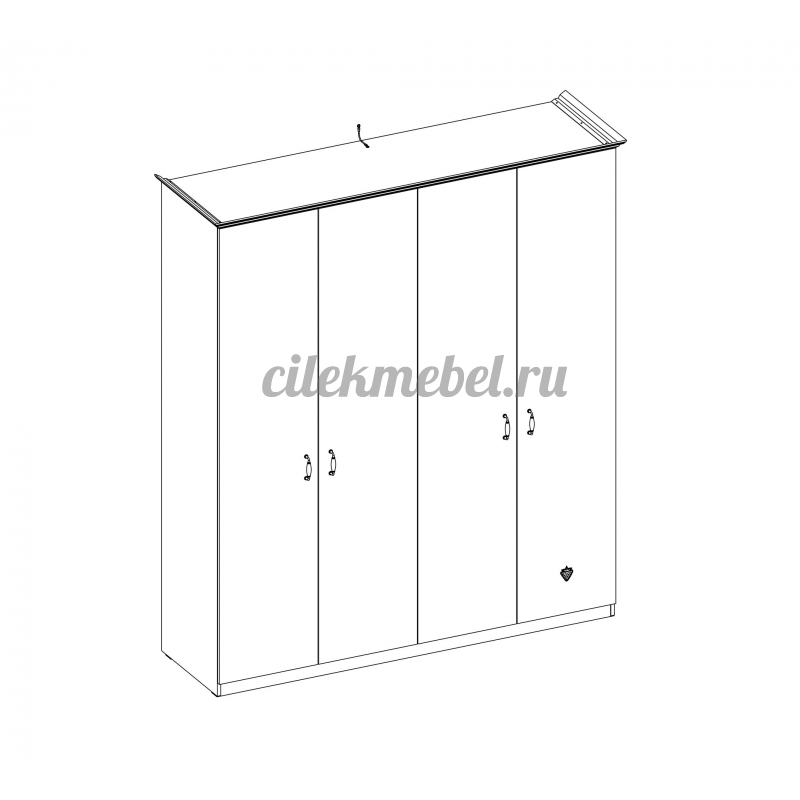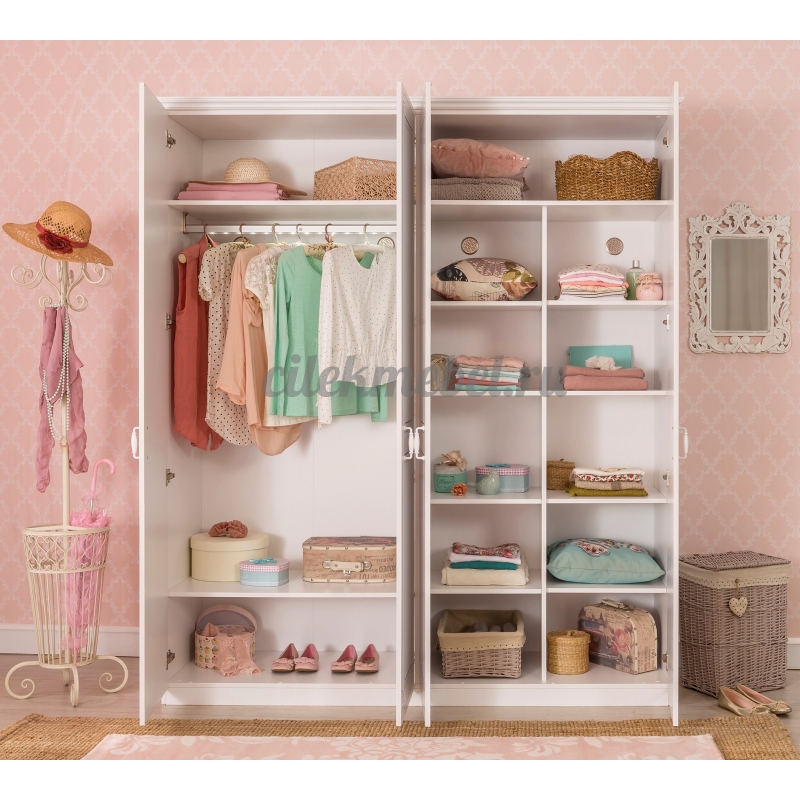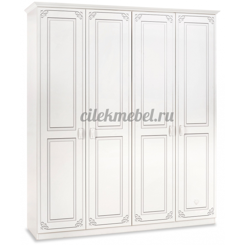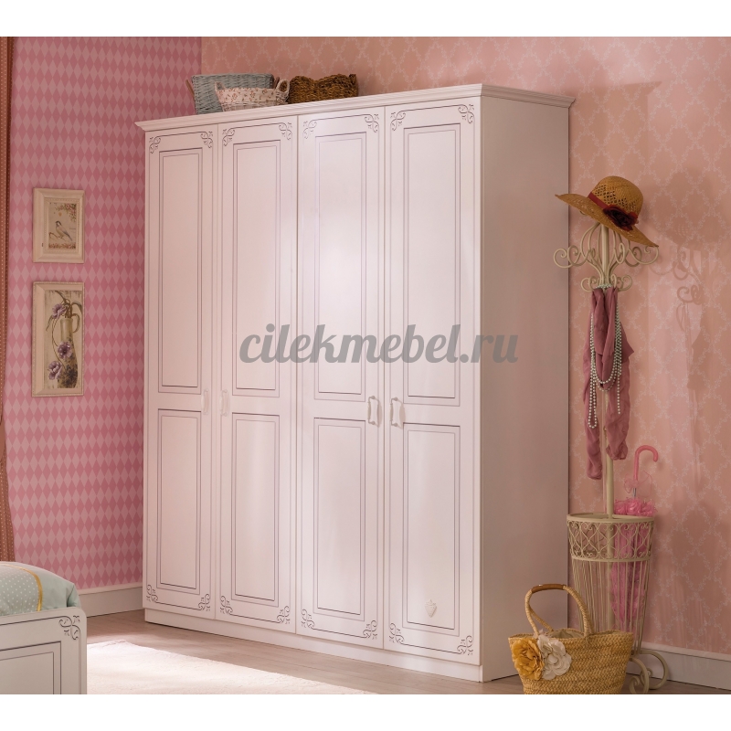 Компания Cilek разработала шкаф четырехдверный Selena (арт. 20.55.1003.00). Он великолепно подойдет для обстановки комнаты девочки. Нежный белый цвет, рисунок с вензелями по кромке позволит шкафу стать главной фигурой в интерьере. Обилие полок различной высоты подойдет для размещения любых вещей - от нижнего белья до верхней одежды, для которой дополнительно встроена удобная штанга под плечики. Пространство шкафа спроектировано так, чтобы можно было дополнительно складывать боксы с обувью и мелочами. Это мечта любой девочки, которая украсит её комнату.