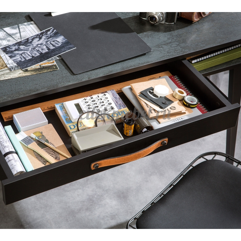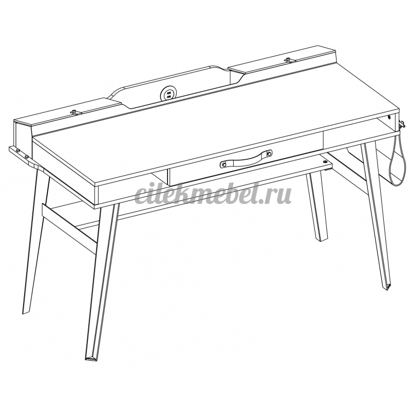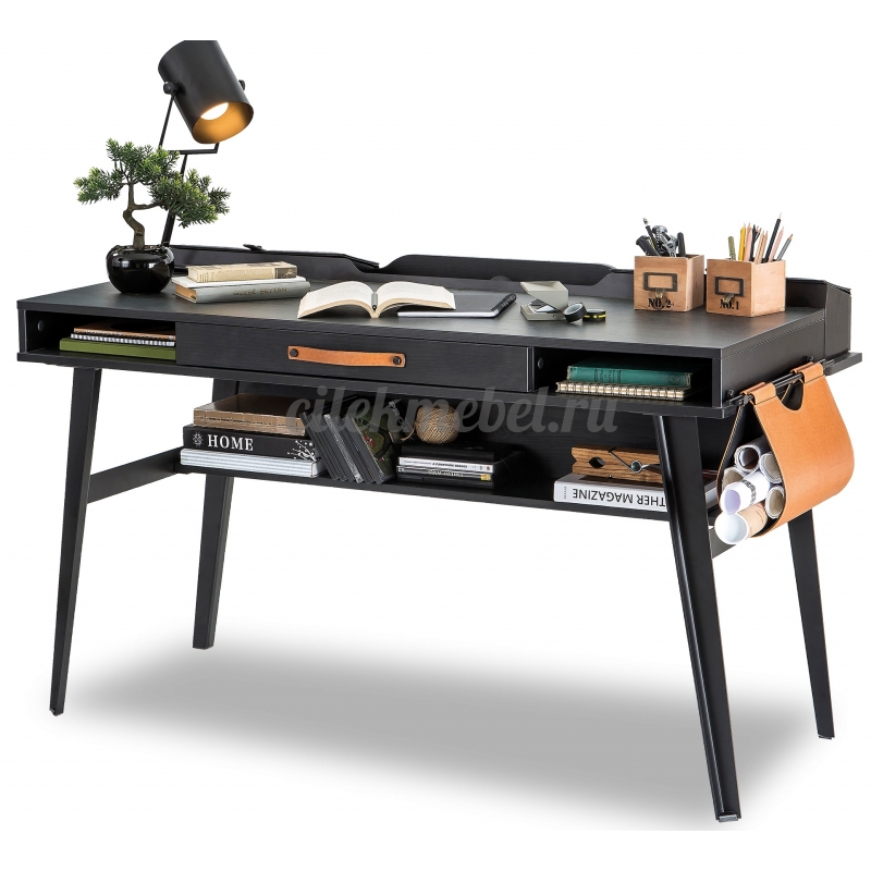 Конструкция стола довольно интересная. Он оснащается четырьмя тонкими, но устойчивыми ножками. Под столешницей расположены полки и выдвижной ящик, где можно хранить книги, тетради и прочее. Дополнительно можно приобрести надстройку. Она полностью соответствует стилевому исполнению стола.